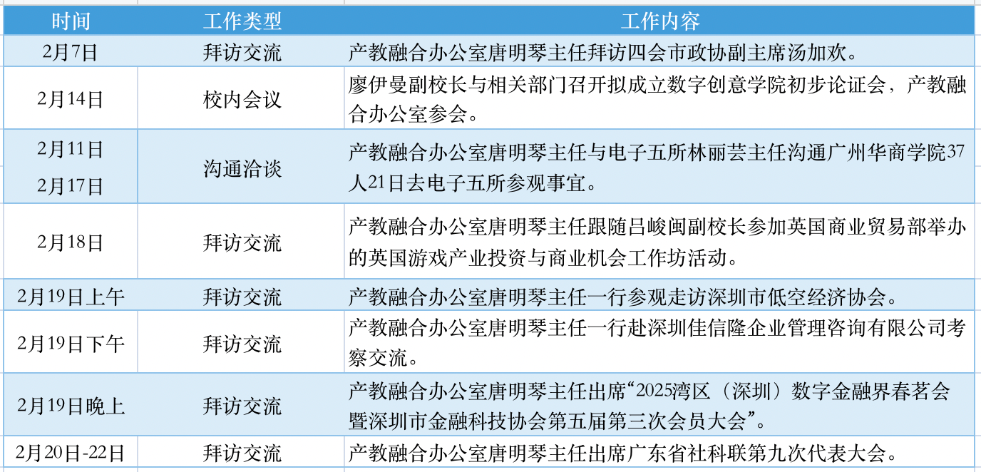 2月19日下午,产教融合办公室唐明琴主任一行赴深圳佳信隆企业管理咨询有限公司考察交流。交流会上,唐明琴主任表示,广州华商学院数字金融学院与佳信隆公司在专业领域高度契合,双方未来可在校企联合研发、课程共建、数字化平台开发等方面开展深度合作。