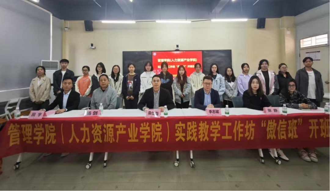 2025年3月10日,管理学院(人力资源产业学院)与傲信(广州)管理咨询有限公司合作打造的实践教学工作坊“傲信班”正式开班,傲信(广州)管理咨询有限公司COO(首席运营官)李志斌、HR调研负责人张静,管理学院党委书记、副院长、人力资源产业学院执行院长袁仕海,人力资源管理系主任杨剑,人力资源产业学院副院长、人力资源管理系副主任田宇,产教融合办公室代表代梦,以及“傲信班”首期15位学员出席。