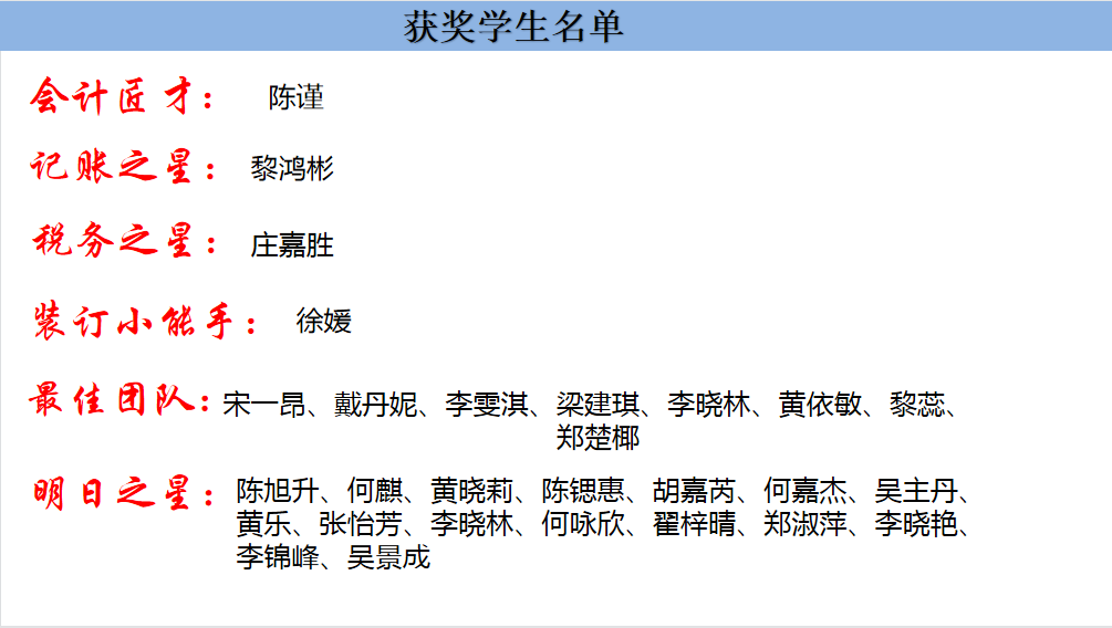 一分耕耘一分收获。接下来由企业领导及校方代表分别为优秀的学生们颁发了 “装订小能手”、“管理标兵”、“明日之星”、“会计匠才奖”、“优秀团队奖”、“三等奖学金”、“二等奖学金”、“一等奖学金”的表彰证书。