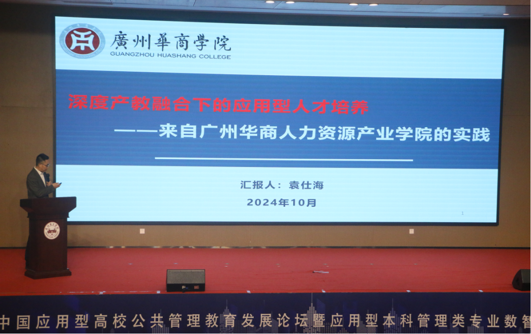 2024年10月26日,在第二届中国应用型高校公共管理教育发展论坛暨应用型本科管理类专业数智化集群建设研讨会上,人力资源产业学院袁仕海执行院长做了题为《深度产教融合下的应用型人才培养——来自广州华商人力资源产业学院的实践》的讲座,深入探讨了在深度产教融合背景下,如何培养适应数智化时代需求的应用型人才,分享了广州华商学院在这一领域的实践经验和成果,展示了广州华商学院在产教融合方面的创新实践和成果。