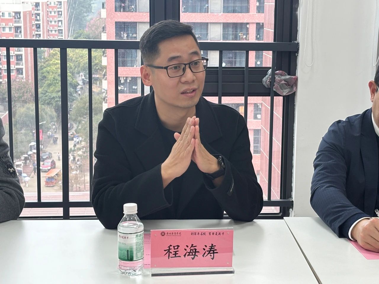 数字经贸学院院长助理石立和传播与传媒学院院长助理动漫游戏产业学院副院长程海涛分别介绍了各自学院 的基本情况、特色专业以及产教融合发展情况。石立提到,数字经贸学院在跨境电商、数字经济等领域具有深厚的教学 基础和实践经验,已初步构建了与产业紧密结合的课程体系。程海涛则强调,传播与传媒学院与动漫游戏产业学院在新媒体传播、动漫游戏等创意领域形成了鲜明的专业特色,并在产教融合方面取得了一定成果。两人均表示,期待与大事件科技集团在相关领域展开深度合作,进一步提升学院的学科建设水平与人才培养能力。