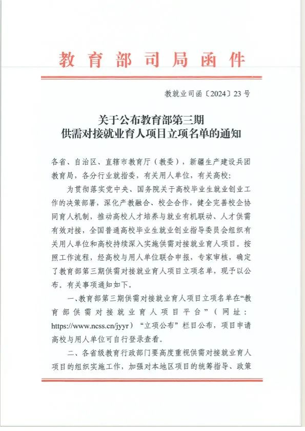 教育部自2021年起持续开展供需对接就业育人项目,目前已经进行到第三期。第三期供需对接就业育人项目分为就业实习基地项目、定向人才培养培训项目、人力资源提升项目、重点领域校企合作项目、重点群体就业帮扶项目五类。教育部供需对接就业育人项目旨在深入贯彻党中央、国务院关于促进高校毕业生就业创业的战略部署,通过深化产教融合与校企合作,实现人才培养与就业市场的紧密衔接,有效对接人才供需,进而推动人才培养与就业工作的有机结合和协同发展。